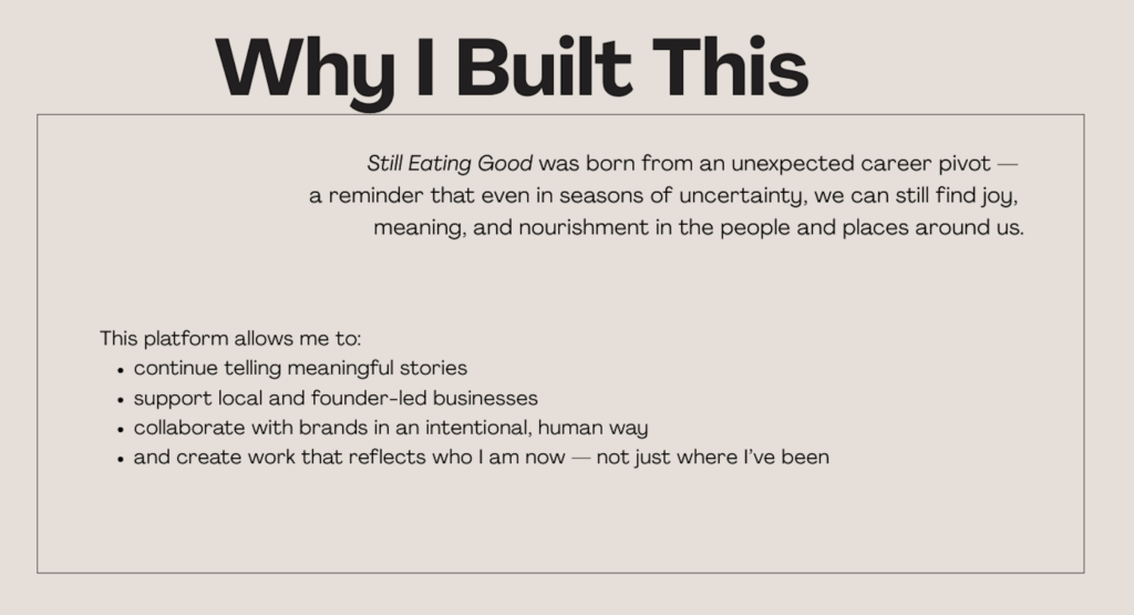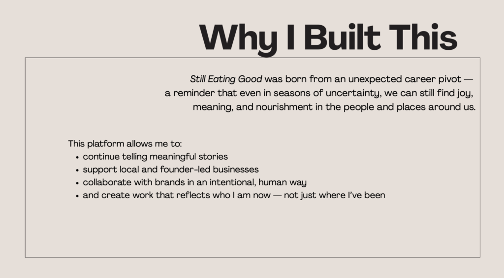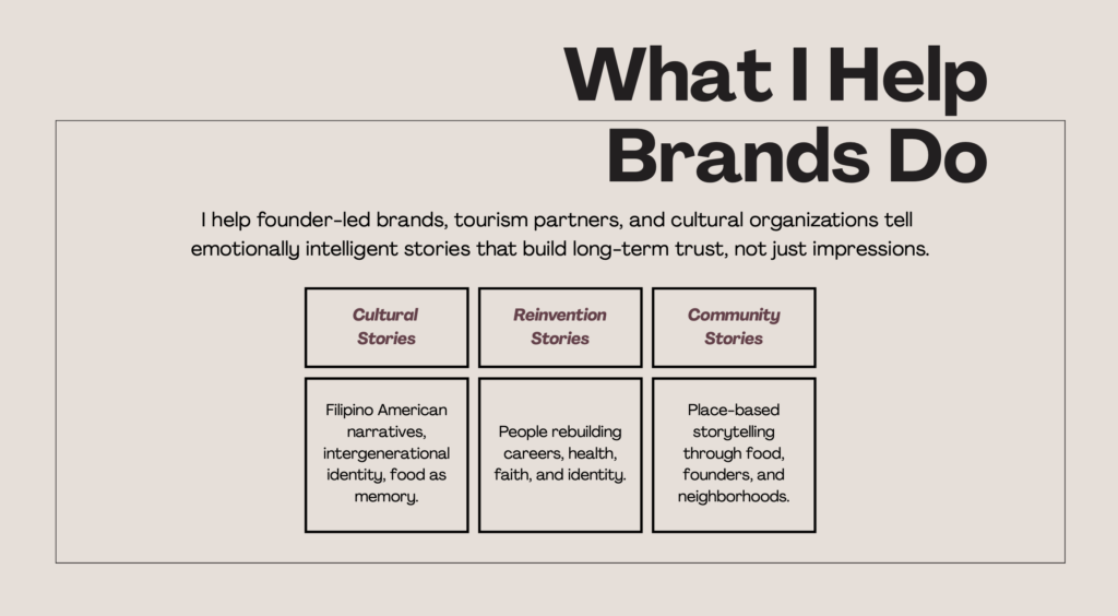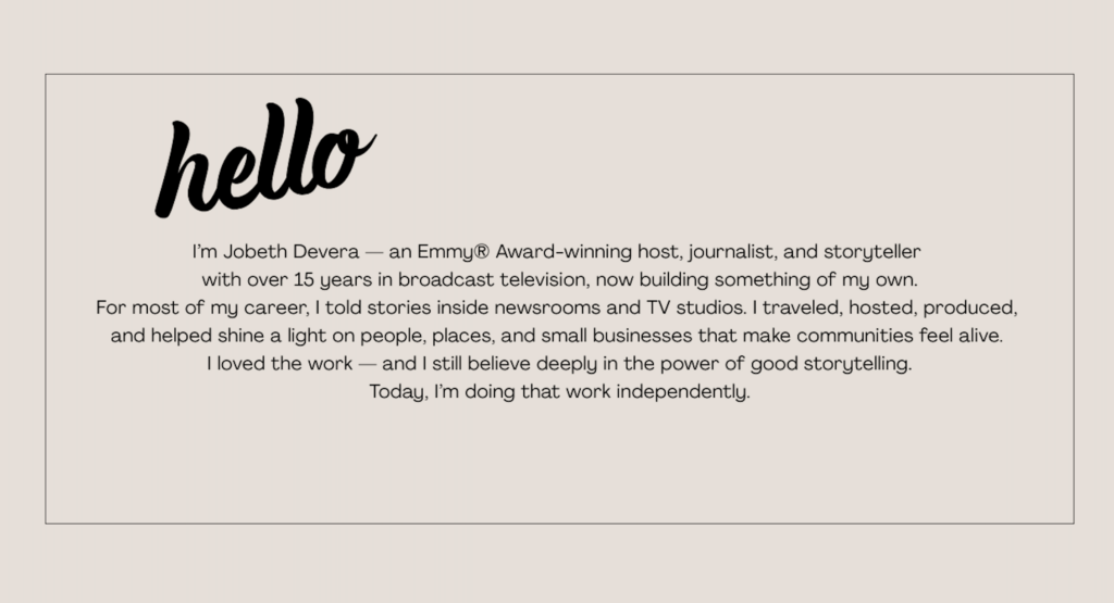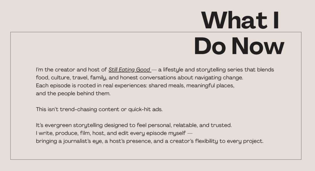 For 15+ years, I’ve spent my career on TV and translating places, people, and experiences into stories that people actually show up for — first through broadcast, and now through digital-first platforms. Today, I’m building independently (while raising two young kiddos) and helping brands turn real stories into high-converting content through authentic, on-camera storytelling.